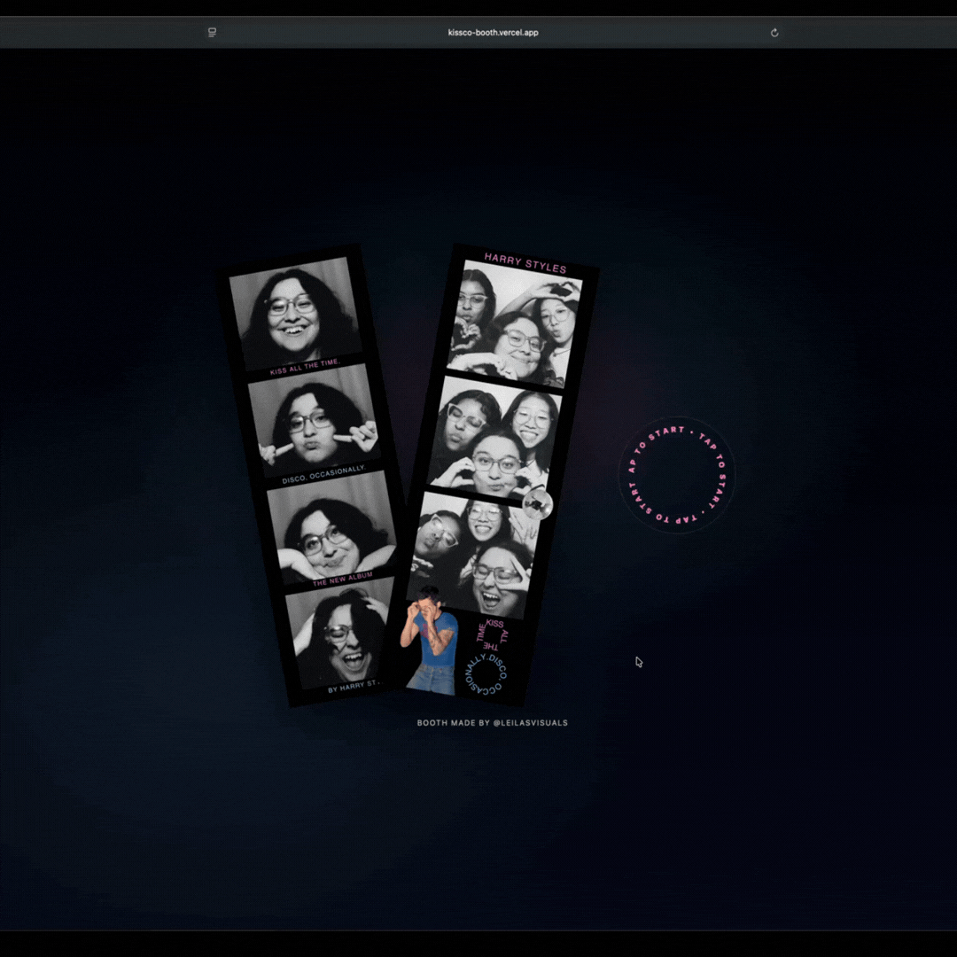 Roles : Creative Direction, Designer, UX, UI, Coding, Web DesignerI designed and built a digital online Photo Booth inspired by Harry Styles’ 4th Studio Album : Kiss All The Time, Disco Occasionally. The site is meant to emulate a booth screen taking the user through the booth, picking their color variant & frame style. I designed 2 strip designs, one for 3 images and one for 4 images. The site then takes the user through a simulated online Photo Booth (similar to Korean booths) where they can take their images and see their poses in real time. Afterwards, they can download or share their strips and start the booth over. Site is optimized for desktop & mobile usage.